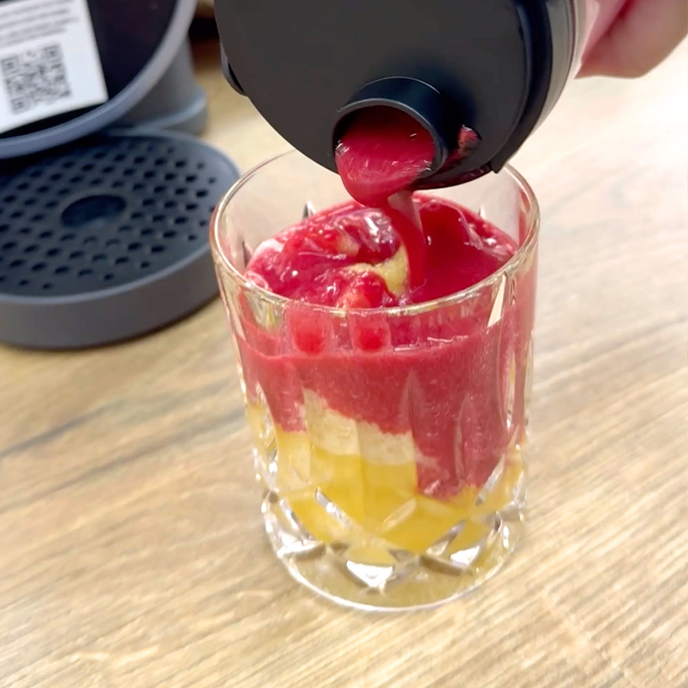 Verteile die goldene Slushi-Basis auf 4 Gläser. Gib anschließend die beerige Mischung vorsichtig oben drauf, sodass sich zwei fruchtige Schichten bilden – wie ein Sonnenuntergang im Glas.