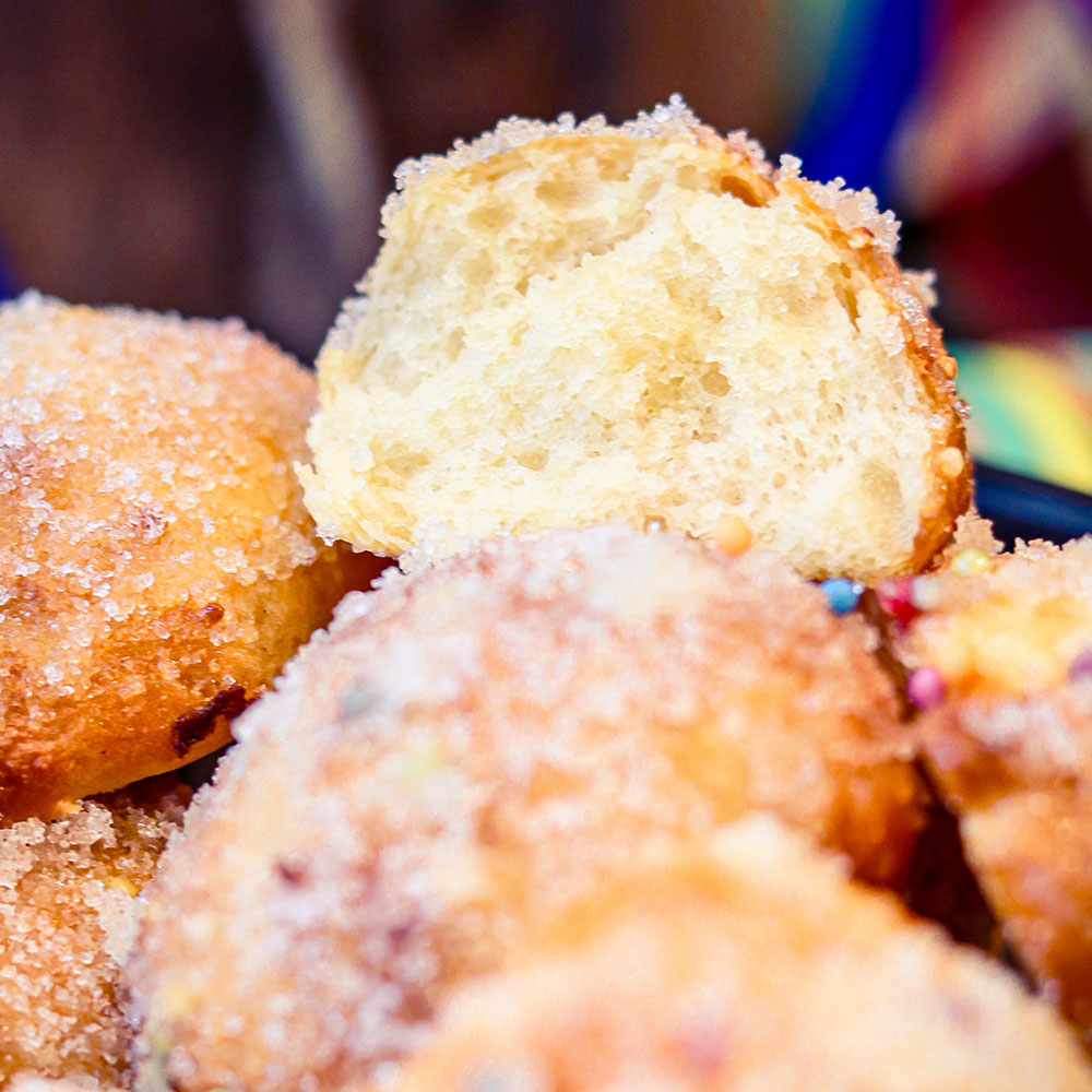 Die Eier mit dem Zucker und der Vanille-Paste schaumig aufschlagen. Den Quark und die Prise Salz dazu rühren. In einer separaten Schüssel Mehl und Backpulver sieben und vermengen. Die Mehlmischung zur Quarkmischen rühren und 2 EL Sonenblumenöl dazu geben. Wer backfeste Zuckerstreusel hat, kann an dieser Stelle noch Streusel in den Teig geben. So hat man auch in den Bällchen den Konfettilook. Man kann auch nur ein paar Streusel auf die fertig geformten Bällchen vor dem Backen geben. Mit Hilfe von zwei Teelöffeln walnussgroße Bällchen formen und direkt in die Heißluftfritteuse setzen. (auf Backpapier würden diese kleben bleiben) Mit etwas Öl besteuben oder bepinseln. Nun bei 150 °C für ca. 14 Min. goldbraun backen. Die noch warmen Quarkbällchen vor dem Servieren mit flüssiger Butter bepinseln und anschließend in einer bunten Zucker und Streusel Mischung wälzen.