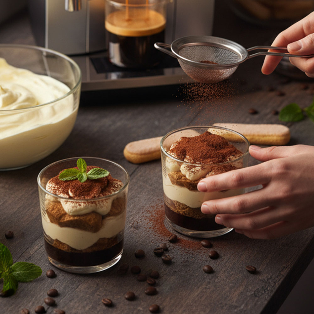 Dank frisch gebrühtem Espresso direkt aus deinem Kaffeeautomaten (z. B. dem Kaffeevollautomaten Sage Barista Express™ Impress) zauberst du in unter 10 Minuten ein cremiges Tiramisu direkts ins Glas ohne Ei – perfekt portioniert, unkompliziert und mit nur wenigen Zutaten.